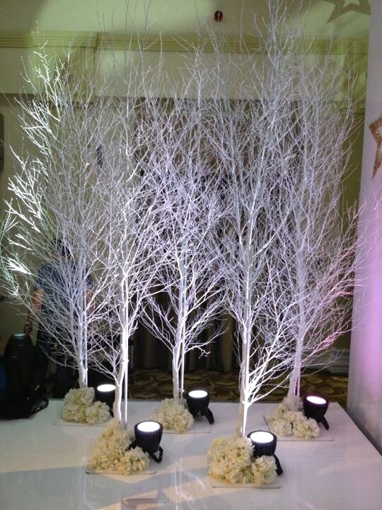 • Fine branched, bare winter trees painted white, on a square wooden base.