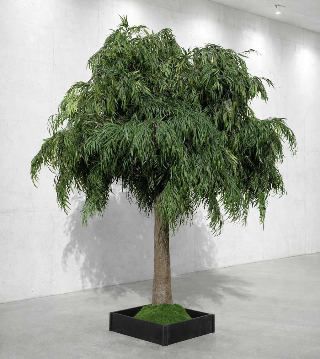• Artificial canopy style tree with cascading willow branches on large sized synthetic trunk.