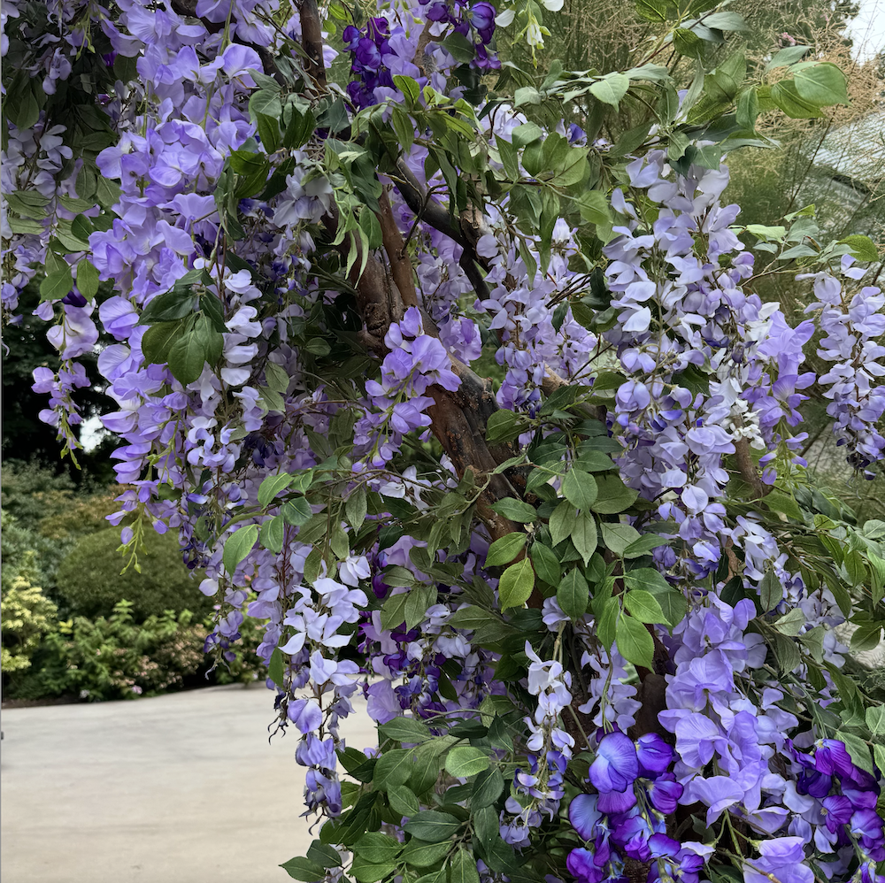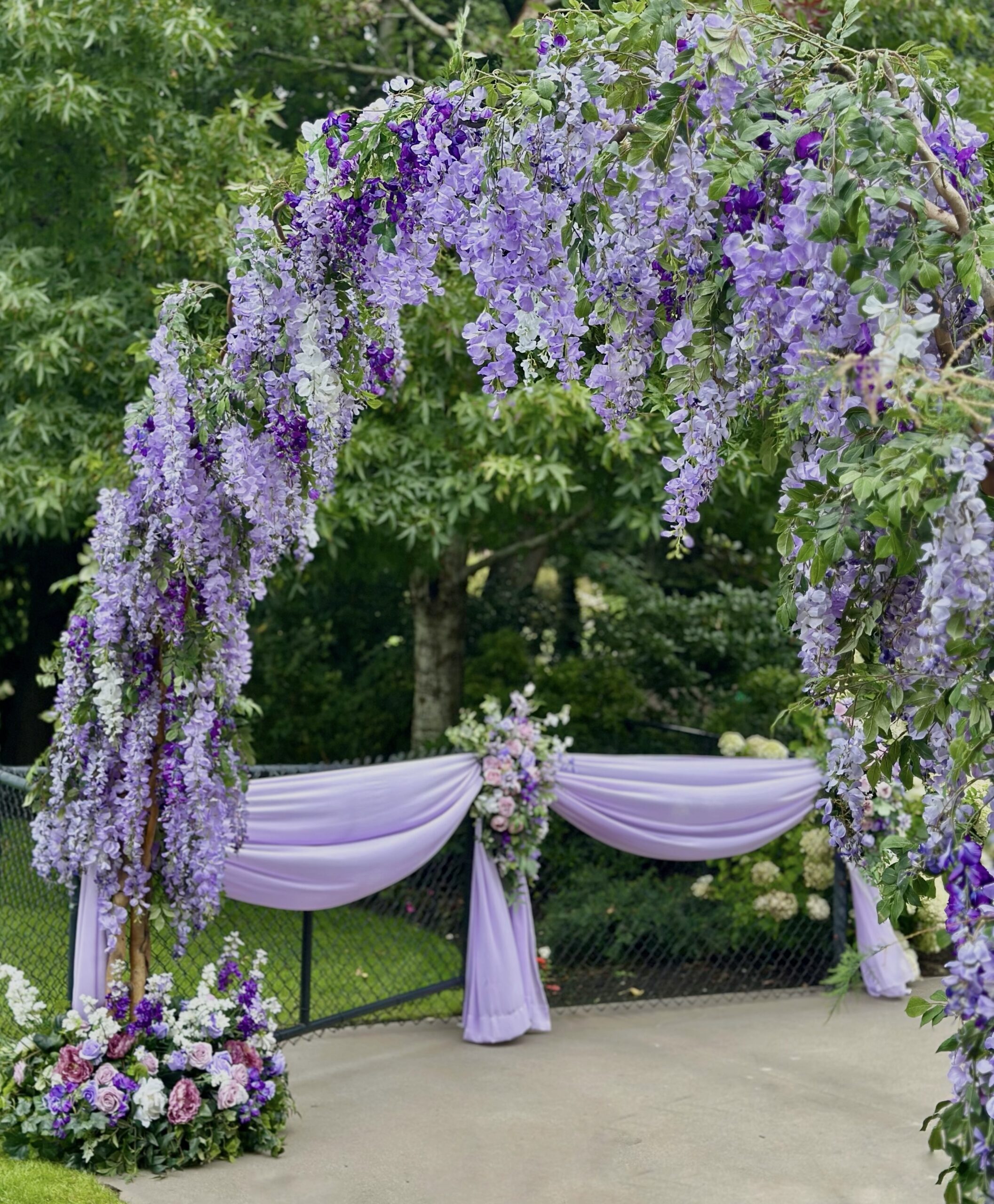 • A gorgeous cascading white and purple wisteria arch built on a natural wood base.
